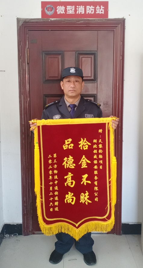 2020年10月23日,湖北領(lǐng)威保安服務(wù)有限公司駐武漢天黎輪胎項(xiàng)目保安隊(duì)獲得中通快遞員贈送的錦旗,他對領(lǐng)威保安隊(duì)員的拾金不昧精神表示贊揚(yáng)和感謝!