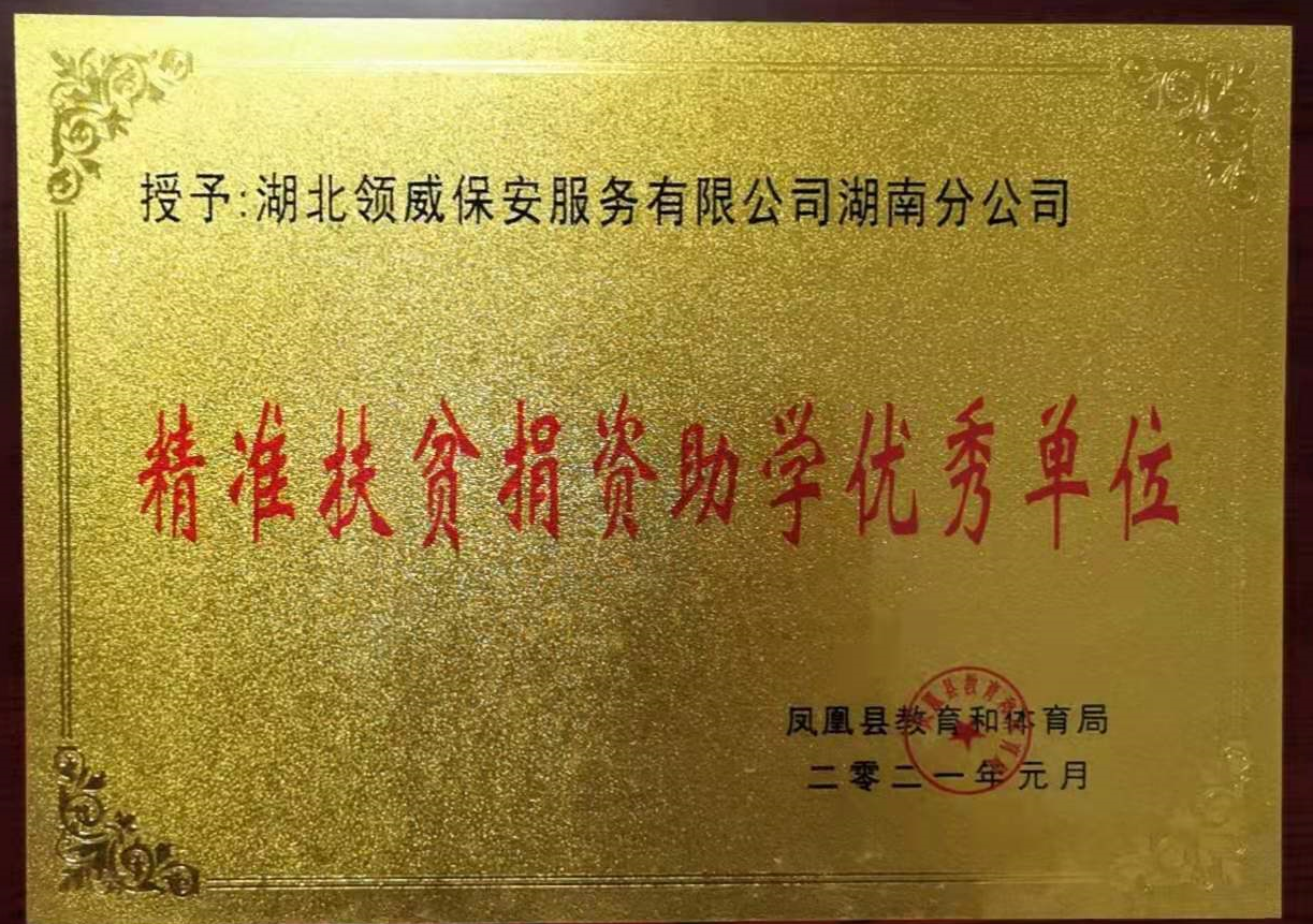 捐贈(zèng)儀式現(xiàn)場,鳳凰縣教育和體育局給湖北領(lǐng)威保安服務(wù)有限公司湖南分公司頒發(fā)了《精準(zhǔn)扶貧捐資助學(xué)優(yōu)秀單位》的稱號(hào)。