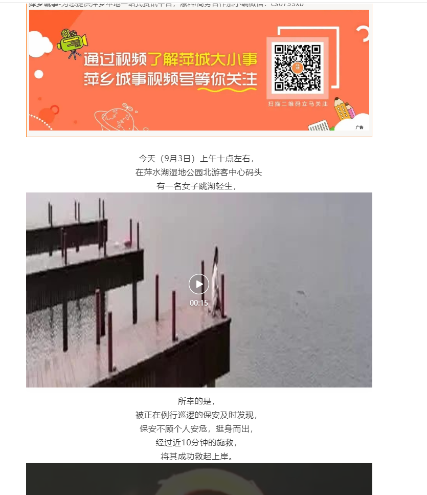 當(dāng)天下午,萍鄉(xiāng)本地新媒體萍鄉(xiāng)城事對事件進行了報道,感謝所有參與施救的人員。 萍鄉(xiāng)市開發(fā)區(qū)園林局朱局長親臨萍水湖濕地公園,特別表揚了班長鄧友國挺身而出,勇于救人的行為。