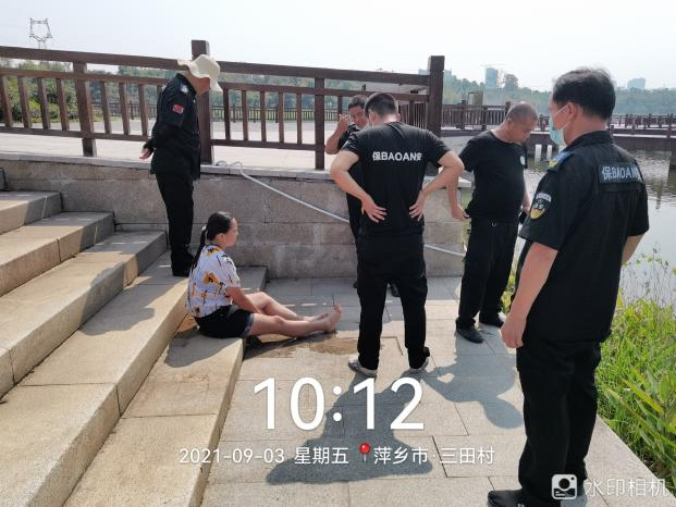 9月3日上午10點左右,領(lǐng)威保安駐萍水湖濕地公園項目保安員陳海軍在萍水湖濕地公園北游客中心碼頭正常巡邏時,發(fā)現(xiàn)一名女子坐在碼頭邊上,疑似有輕生念頭。保安員陳海軍立即上前準(zhǔn)備詢問,被該女子制止。陳海軍見此情景,馬上通過對講機和微信工作群聯(lián)系當(dāng)班班長和隊長。當(dāng)班班長譚志剛、鄧友國得知消息后立刻報警,并迅速趕往現(xiàn)場。班長鄧友國趕到時,發(fā)現(xiàn)該女子已經(jīng)跳入湖中,如果不及時救援,該女子就會有生命危險。班長鄧友國急忙打開碼頭消防柜,拿著救生圈果斷地跳入湖中,游到該女子身邊進行水中施救。經(jīng)過近10分鐘的施救,該女子被成功拖到岸邊,上岸后,區(qū)域總監(jiān)易衛(wèi)華、隊長張繁榮組織保安員將該女子圍住,以防止該女子再有輕生行為。待女子情緒稍微安定后,易總開始對女子進行耐心勸解,并將其帶到陰涼處休息,等待當(dāng)?shù)嘏沙鏊窬瘉硖幚怼?br />