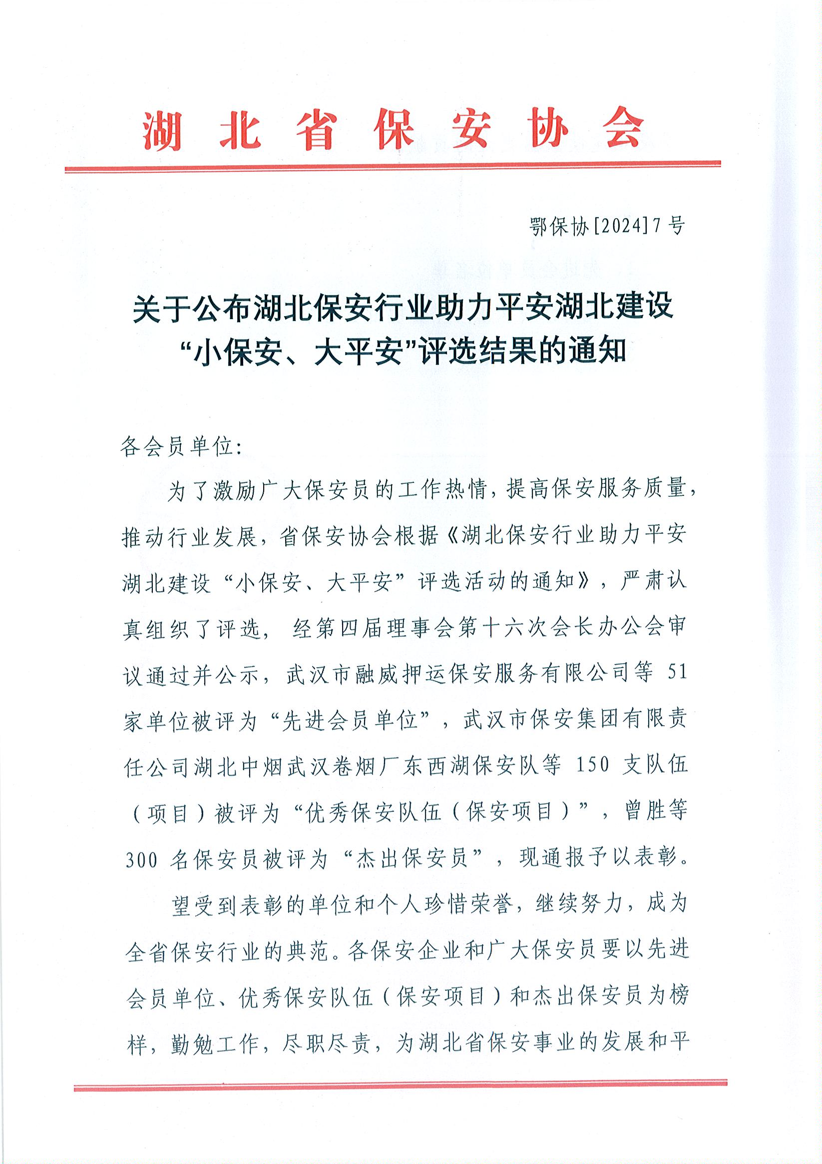 在平安湖北建設(shè)“小保安、大平安”評選活動中,我公司榮獲“先進會員單位”殊榮,荊門龍山世茂保安隊榮獲“優(yōu)秀保安隊伍”稱號,李容同志榮獲“杰出保安員”榮譽。以上成績均獲得湖北省保安協(xié)會的通報表彰,特此喜報!