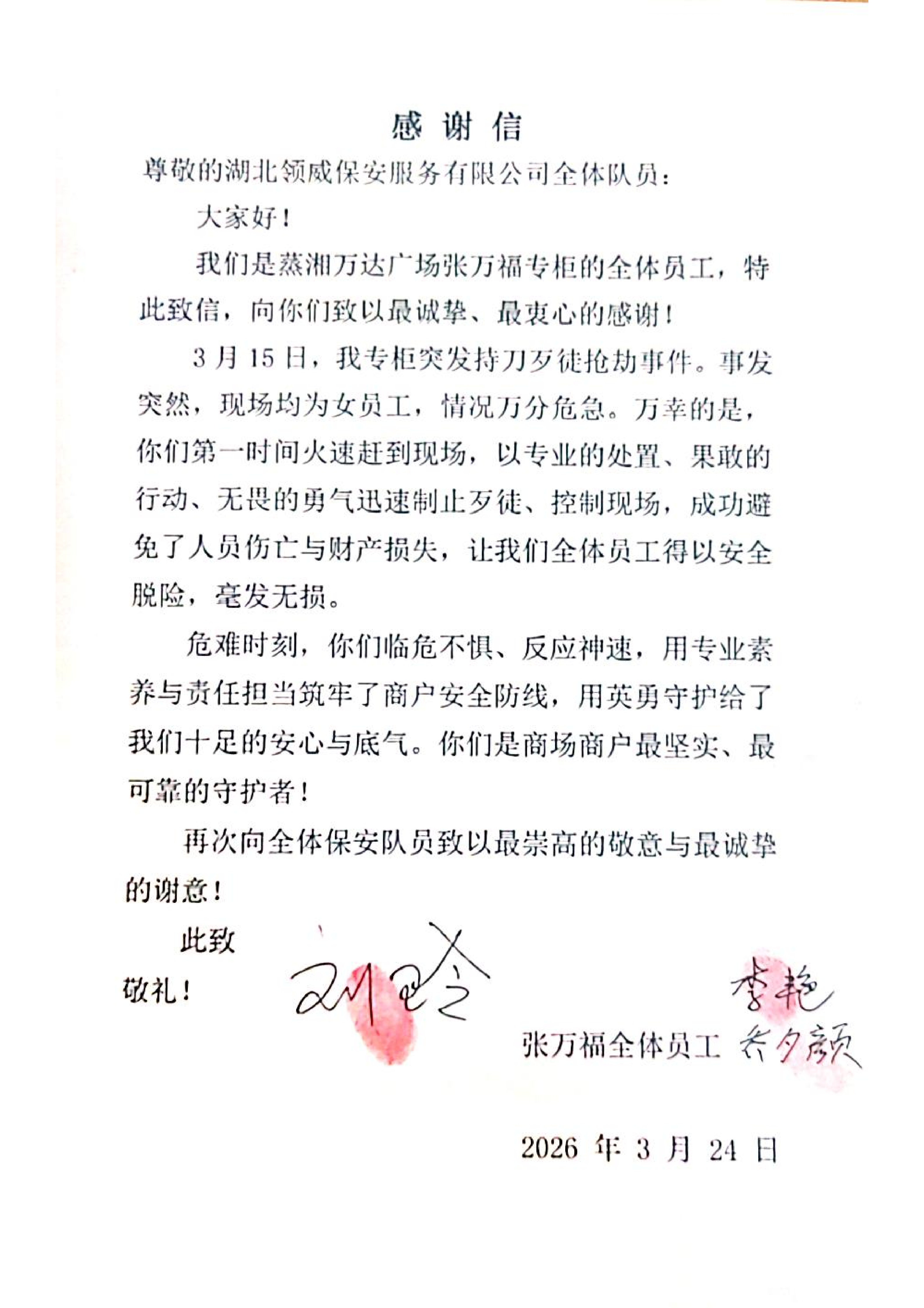 近日,湖北領威保安服務有限公司收獲一份特殊榮譽--由湖南衡陽蒸湘萬達廣場張萬福珠寶專柜專程送來感謝信與錦旗,致謝領威安保隊員聯(lián)合警方快速處置持刀搶劫突發(fā)事件、全力守