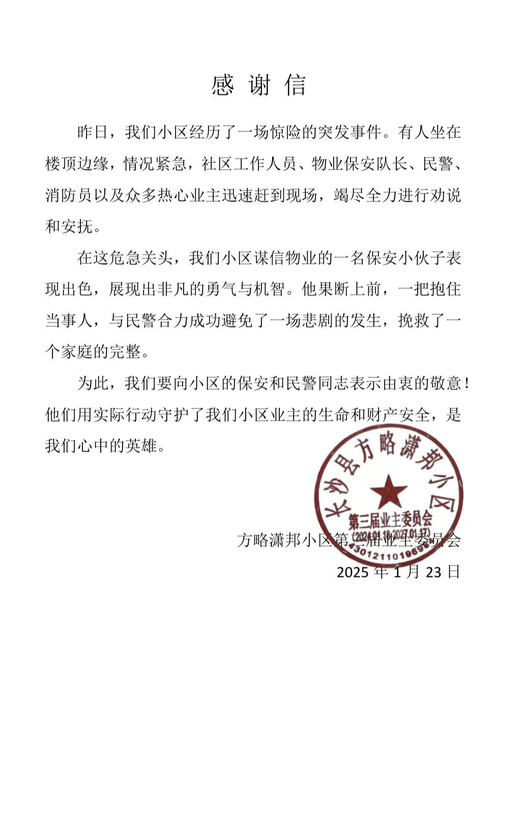 2025年1月21日18點(diǎn)35分左右,湖北領(lǐng)威保安公司湖南分公司駐方略瀟邦項(xiàng)目的隊(duì)長(zhǎng)高云炳,在巡邏時(shí)接到了業(yè)主的通知,10棟2單元樓頂有一業(yè)主企圖跳樓輕生。